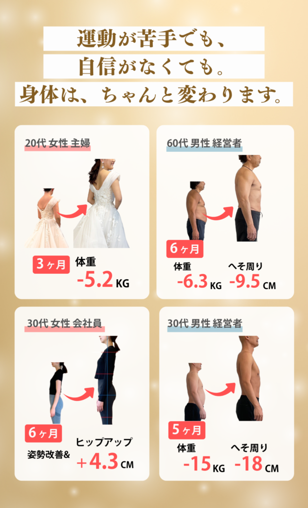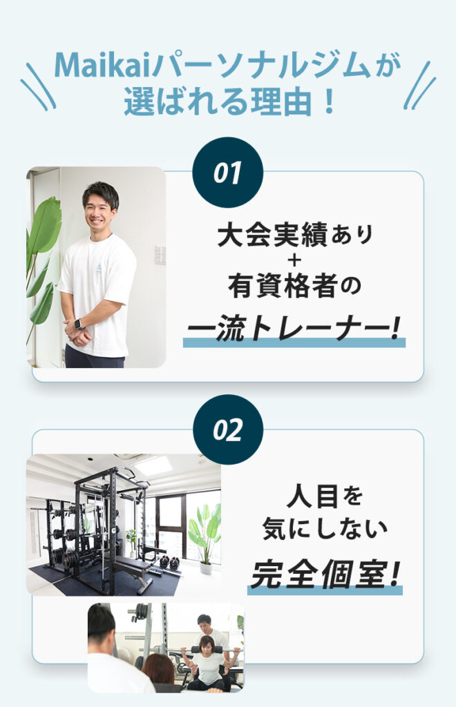 kmTrustindex は、レビューの元のソースが Google であることを確認します。 なかなか思うように産後ダイエットできず、子どもを連れて通えるジムを探していたところ、こちらを見つけました。 ジム内は綺麗でベビーサークルも置いてあり、安心して子どもと一緒に通えます。 トレーニングについても正しいフォームやどこの部位に効かせたいか等、丁寧に説明してくださり楽しくできています。 目標に向けて頑張りたいと思います! 坂口彩Trustindex は、レビューの元のソースが Google であることを確認します。 家から近かったので体験行ってみたら、とっても綺麗で楽しく運動できそう!と思い通い出しました! 全くの初心者🔰だったけどレベルに合わせてメニューを作ってくれているので、安心です😊 今ではしっかり筋トレもできるようになってきて、少しづつ筋力がついてきているのがわかります☺️ いつもポジティブな言葉をかけてくれてめちゃくちゃ楽しく続けられてますっ♪ これからもよろしくお願いします🏋️♀️✨ MTrustindex は、レビューの元のソースが Google であることを確認します。 24時間ジムに通っていましたが、マシンの使い方が分からず成果も出ないので、パーソナルジムを探していた所、自宅から通いやすくて、他店のような契約の縛りがなく初心者に始めやすい点が魅力に感じて入会しました。トレーニング後はいつも達成感があり、身体が元気になったと感じることができます。トレーナーさんの個別に合わせたトレーニングメニューと、明るく前向きな言葉がけのお陰だと思います。これからもメンタルと身体の健康のために通いたいと思います。 ななみたこたこTrustindex は、レビューの元のソースが Google であることを確認します。 4月からこちらのジムに通わせて頂いてます。 パーソナルトレーニングは初めてでした。ジムで自分で筋トレするのも全く続かず、体重も減らなくて、自分を変えたくて、家の近くのパーソナルジムを探しこちらを見つけました。最初は運動嫌いですし、久しぶりの筋トレで体も重かったですが、日に日に体が軽くなり、体重も減っていき、少しづつ引き締まっていくのを感じ、できることが増えて、通うのがとても楽しくなってます!ジムのトレーナーの方達もとても親身に話を聞いてくださったり、体重が思うように減らなくて焦ったりしたときや、食べすぎた時に自己嫌悪になった時もポジティブに気持ちを変えて下さり、明日からまた頑張ろうと切り替えれます!何をしても体重が減らなかったのに、通ってから二ヶ月でマイナス5キロ減量できました。プロの指導を受けるとこんなにも体が変わるんだなと感激してます^_^これからも頑張りますのでトレーニングや指導をよろしくお願いします♪ あきTrustindex は、レビューの元のソースが Google であることを確認します。 初めてのパーソナルトレーニングで不安でしたが、丁寧にわかりやすく説明してくれます。普段運動をしないので筋トレや筋肉痛が辛い時もありますが、トレーナーさんがいるので頑張れています。食事に関する細かい質問にも丁寧にアドバイスしてくれます。自分の目標に少しづつ近づいてるのが楽しいです。 NanaTrustindex は、レビューの元のソースが Google であることを確認します。 オープン当初から、お世話になってます。 複数パーソナルトレーニングジムを経験してますが、Maikaは健康的な体を作るために最適なのトレーニングプログラムを考えてくださるトレーナーさんがいらっしゃると思います! 今後も、よろしくお願いします!! Tora KTrustindex は、レビューの元のソースが Google であることを確認します。 たくさん褒めてくださるのでポジティブに頑張れます💪 ATrustindex は、レビューの元のソースが Google であることを確認します。 ここに通い始めてトレーニングの質が良くなりました!!トレーナーの方がめちゃくちゃ詳しいです。正しいフォームで自分にあったやり方を教えてくれるので効果を感じます。徐々に体も引き締まって筋肉もつきつつ、体重も体脂肪も減ってきました。とても良いパーソナルジムです。 一瀬貴幸Trustindex は、レビューの元のソースが Google であることを確認します。 通い始めて2ヶ月程で、体型がすごく変わりました。自分の目標や体型をみてトレーニングを組んで頂けるので無理なく続けられます。また、トレーニングや筋肉・食事の事も勉強されているので安心して何でも相談出来ます。