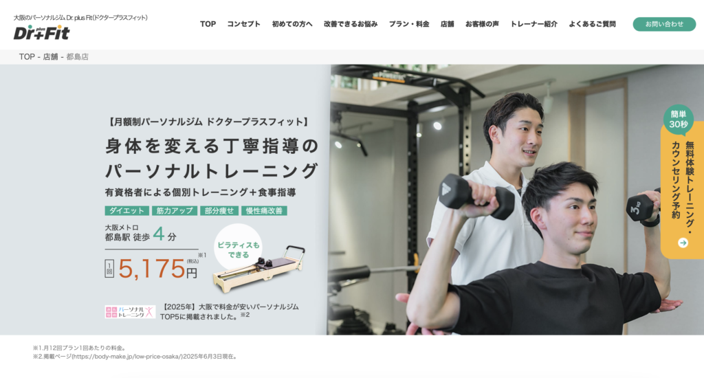 Dr. plus Fit 都島店医師監修。筋トレ+ピラティス要素を取り入れ、姿勢改善や慢性痛など機能改善にフォーカス。LINE食事相談無料。姿勢改善・健康目的/コンディショニング重視