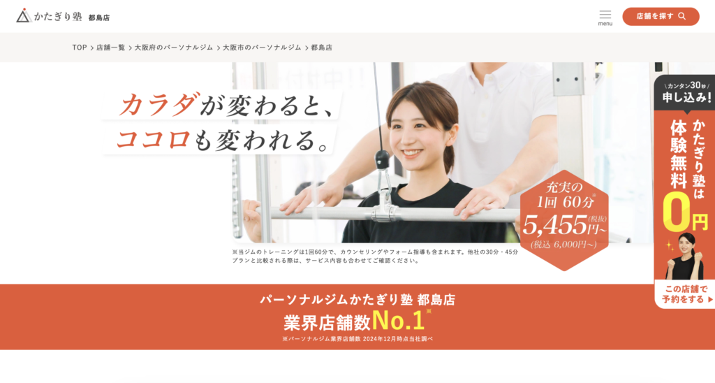 パーソナルジム かたぎり塾 都島店は、全国に多数の店舗を展開するパーソナルジムブランド「かたぎり塾」の都島エリア拠点です。